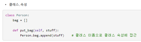 * 클래스로 인스턴스를 만든 뒤에도 인스턴스.속성 = 값 형식으로 속성을 추가할 수도 있다. 이렇게 추가한 속성은 해당 인스턴스에만 생성된다.