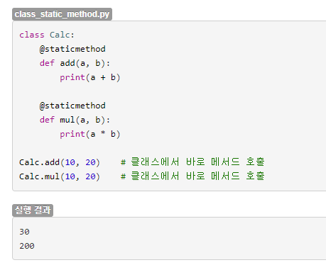 * 정적 메소드는 self를 받지 않으므로 인스턴스 속성에는 접근할 수 없다.